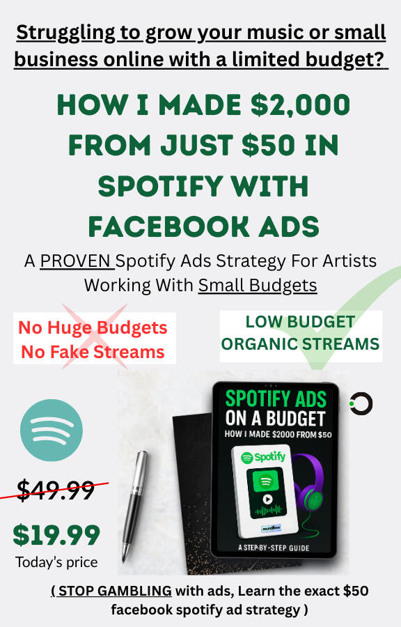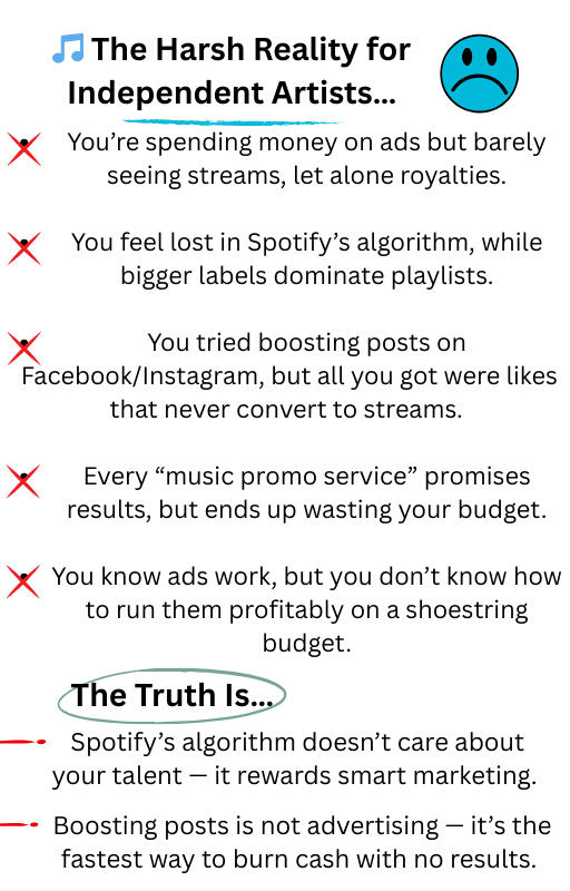 ✅ The exact Facebook &Instagram ad setup that drives listeners straight to Spotify.✅ How to craft ad copy and creatives that grab attention instantly.✅ Hidden audience targeting methods labels don’t want you to know.✅ The retargeting trick that makes fans keep coming back.✅ How to scale your ads profitably without wasting a single dollar.No fluff. No gimmicks. Just a battle-tested system built for independent artists, record labels, and music marketers who are tired of guessing.