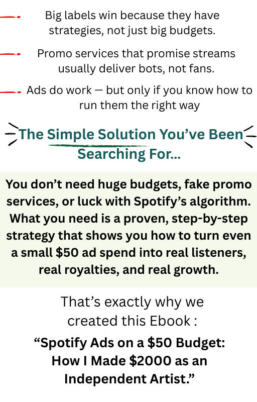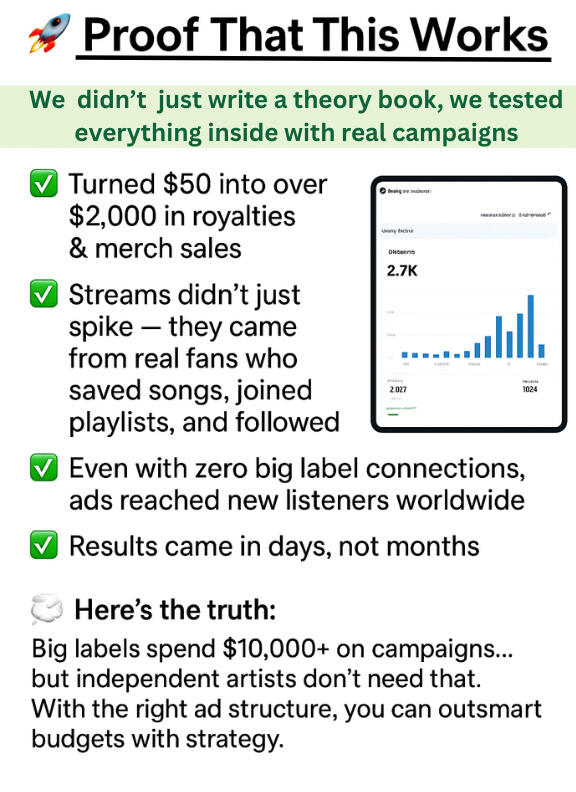 ✅ The exact Facebook &Instagram ad setup that drives listeners straight to Spotify.✅ How to craft ad copy and creatives that grab attention instantly.✅ Hidden audience targeting methods labels don’t want you to know.✅ The retargeting trick that makes fans keep coming back.✅ How to scale your ads profitably without wasting a single dollar.No fluff. No gimmicks. Just a battle-tested system built for independent artists, record labels, and music marketers who are tired of guessing.